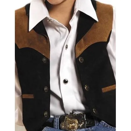 Boys Roper Vest: Boys Roper Western Outerwear. An adorable vest for your adorable cowboy! This Black Contrast Lapel Suede Vest from Roper is made of sueded leather with a contrast trim; 2 point front yoke; 3 point back yoke; notch collar; double welt pockets; and 3 button front.